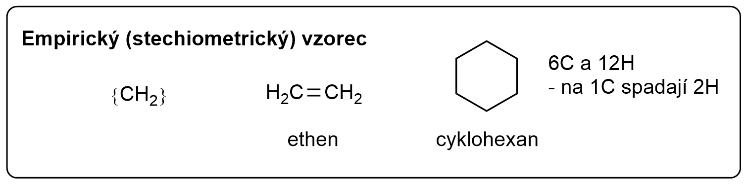 Empirický (stechiometrický) vzorec – druhý název je pro naše účely názornější. Hovoří o stechiometrii, jak jistě už víte, u chemických rovnic se nám také vyskytuje pojem stechiometrie. U rovnic určuje poměr reagujících látek, např.: 2 molekuly X reagují s 1 molekulou Y (poměr 2:1), tak u vzorců vyjadřuje poměrové zastoupení prvků ve struktuře. Tyto vzorce se zapisují do složitých závorek {…}. V organické chemii se často nevyskytují kvůli jejich nejednoznačnosti: jeden vzorec zahrnuje mnoho struktur. Jako příklad postačí následující ukázka: