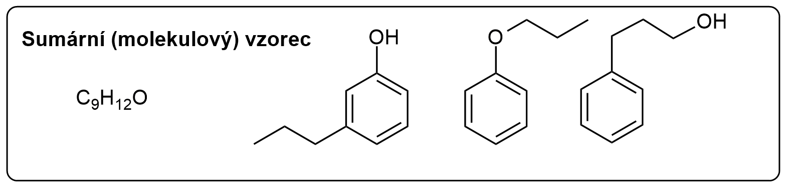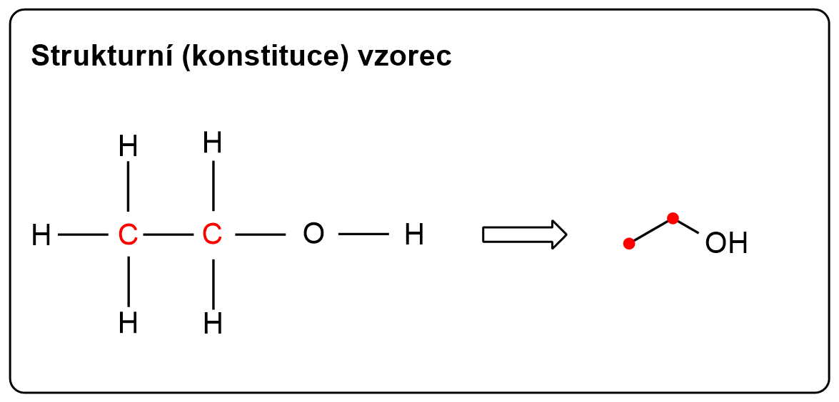 Strukturní (konstituční) vzorec – vystihuje typy a rozložení vazeb v molekule. Často je zjednodušován z časových důvodů: zápisem pouze struktury vazeb uhlíků a vazeb funkčních skupin, každý záhyb (ostré místo) označuje atom uhlíku, \(C\) ani \(H\) se nezapisují, s výjimkou heteroatomů s příslušným počtem vodíků a zmiňovaných funkčních skupin!