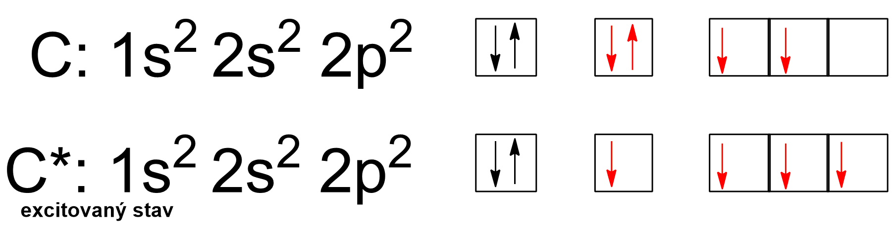(červeně zvýrazněny valenční elektrony podílející se na vzniku vazeb)