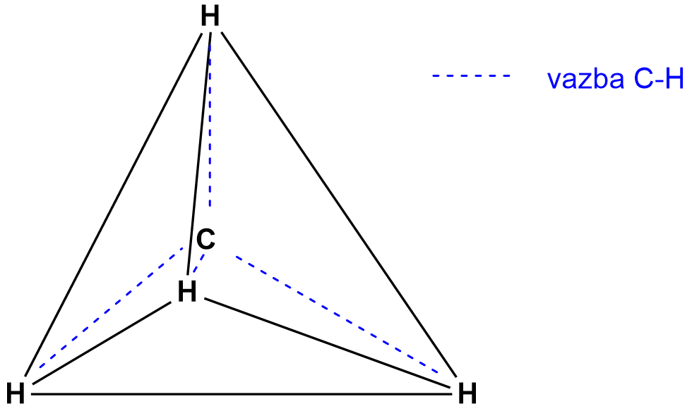 V organické chemii je uhlík vždy 4vazný! Jelikož má limitovaný počet orbitalů (2. perioda), nemá v excitovaném stavu (stav o vyšší energii, elektron přechází do energeticky vyššího orbitalu) žádný volný orbital pro vytvoření koordinačně-kovalentní vazby. Nejzákladnějším uhlovodíkem a organickou látkou je methan (\(CH_4\)). Uhlík je zde 4vazný a vodík 1vazný. Geometricky tvoří pravidelnou strukturu tetraendru (čtyřstěnu).