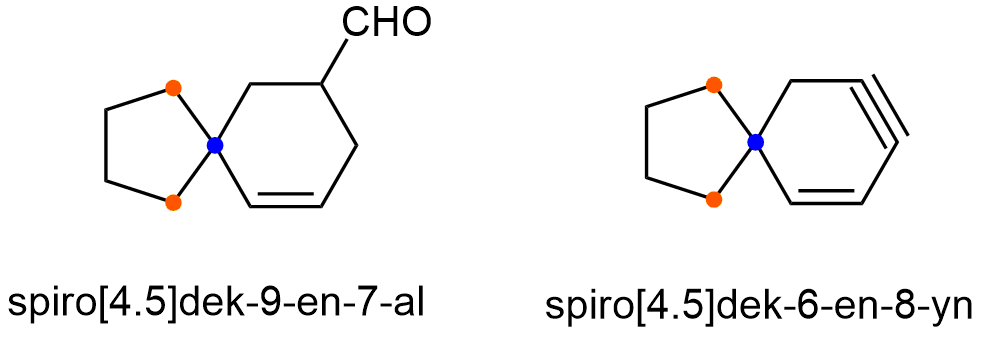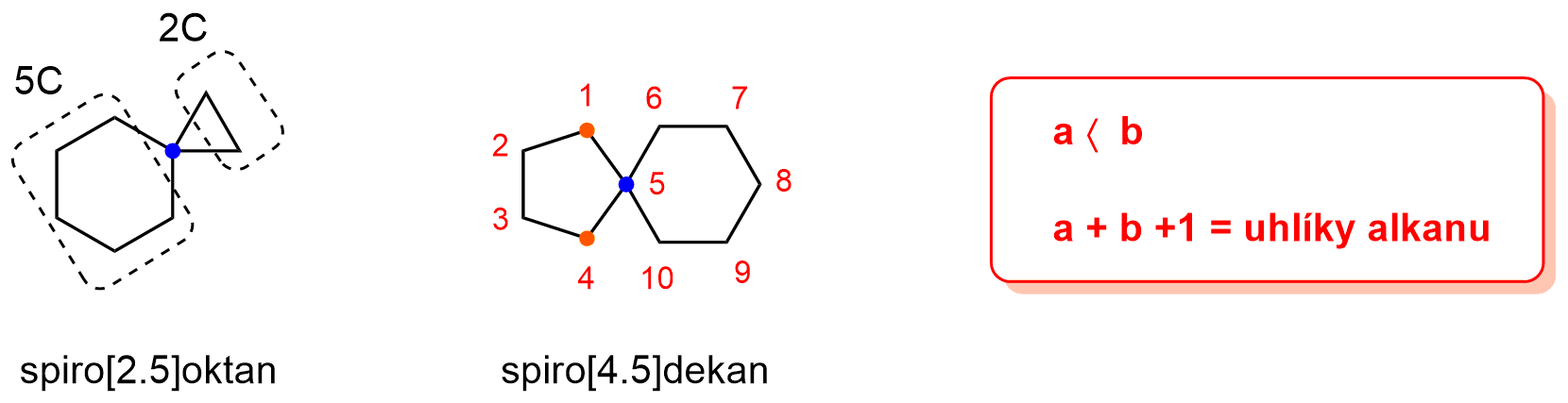 Obrázek 2: Příklady názvů spirocyklů, číslování a pravidel (červeně označené).