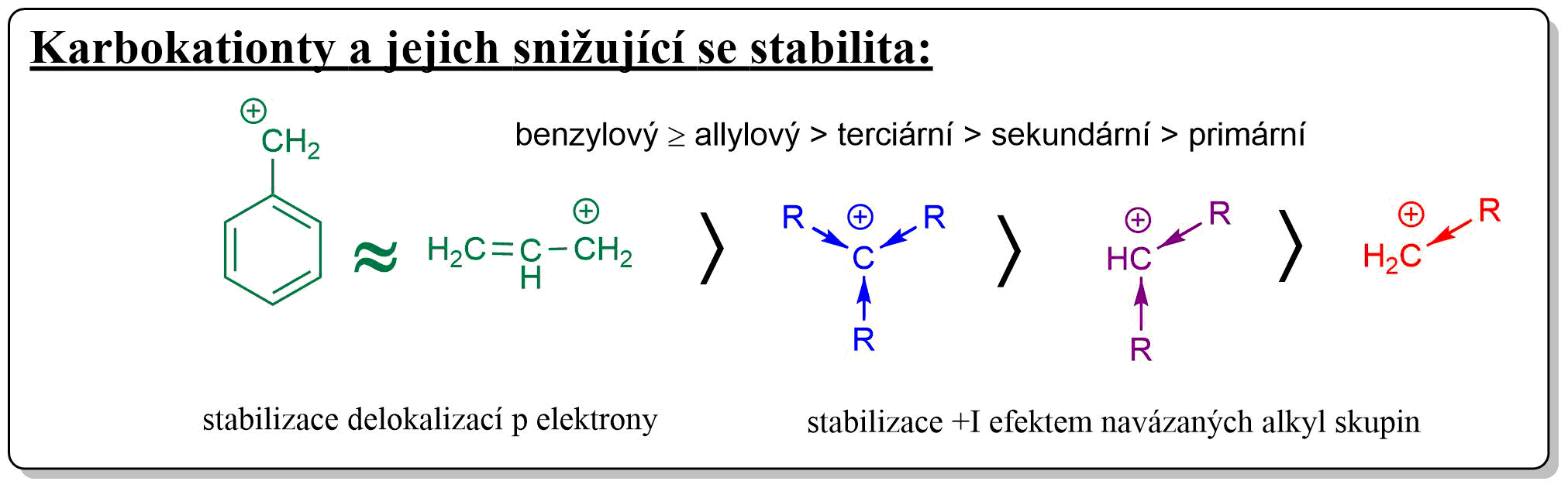 Obr. 1: Snižující se stabilita karbokationtů
