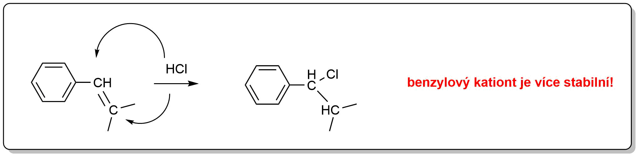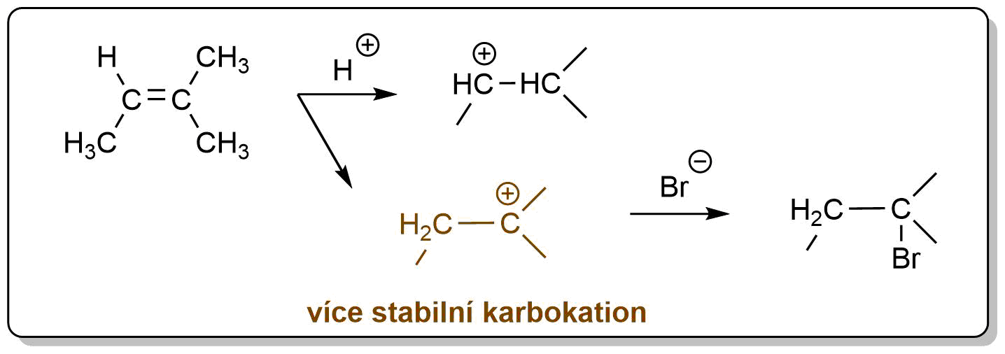 Obr. 2: Adice bromovodíku a vznik stabilnějšího kationu dle Markovnikova pravidla