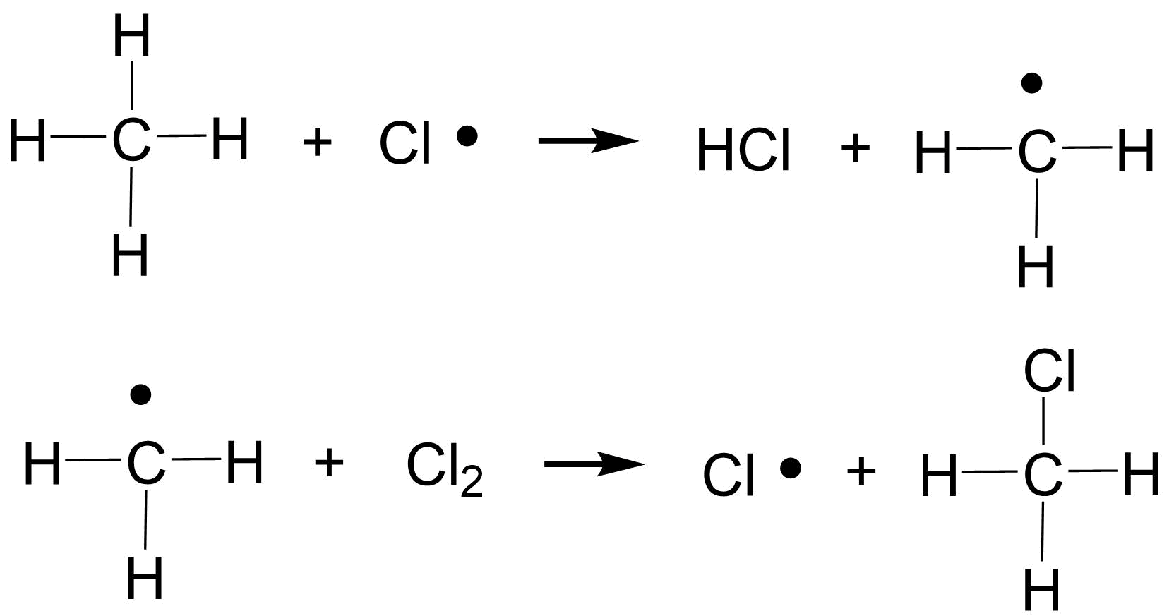 Druhým krokem je reakce radikálu halogenu s alkanem. Po této reakci vzniká radikál alkanu a \(HCl\). V rámci této reakce dochází k okamžité reakci radikálu alkanu s molekulou halogenu za vzniku halogenalkanu a radikálu halogenu. Celému druhému kroku říkáme propagace. Propagace, jak napovídá název, je reakce řetězová.