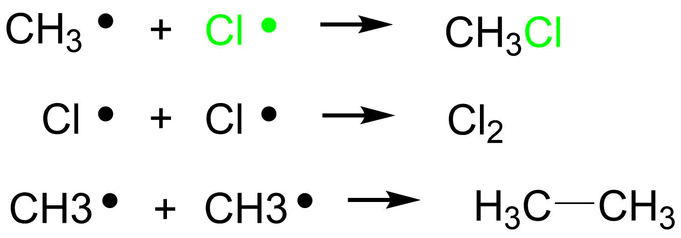 Posledním krokem je terminace, kdy zreagují zbylé (poslední) radikály v reakční směsi mezi sebou a spárují si svoje osamocené elektrony. Po těchto reakcích ve směsi nezůstávají radikály. Vše výše popsané je zaznamenáno na následujícím příkladu CHLORACE METHANU: