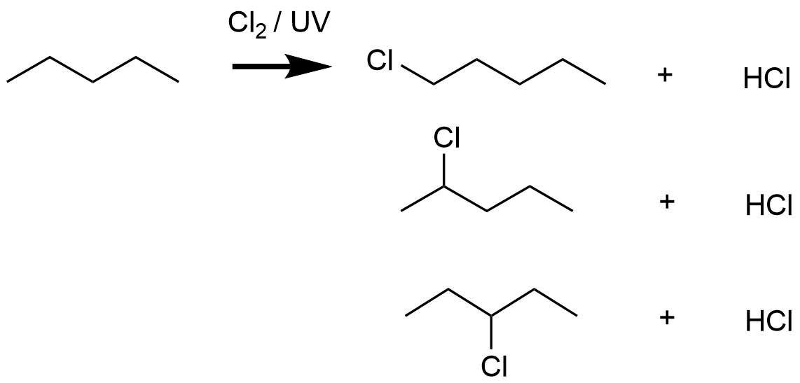 Při nadbytku chlóru vznikají i více chlorované alkany. V případě methanu: chlormethan, dichlormethan, trichlormethan (chloroform), tetrachlormethan.