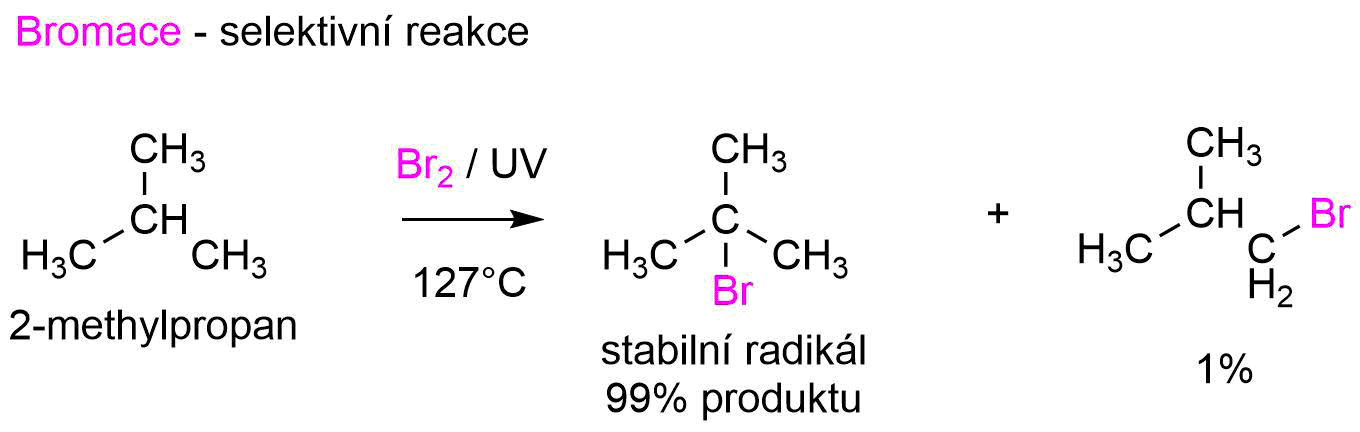 Při halogenaci delších či rozvětvených alkanů je situace složitější, jelikož vznikají radikály, které jsou stabilnější. To neznamená, že by ostatní varianty nevznikaly, pouze nám to hovoří o tom, jaká z látek bude teoreticky v nadbytku nad ostatními. Problematika je, bohužel, mnohem více složitá než se zdá, jelikož například chlorace není příliš selektivní, avšak naopak bromace selektivní je (záleží na stabilitě vznikajících radikálů). Dovolím si tuto pokročilou problematiku pouze zmínit, jelikož více detailů čtenář středoškolské problematiky nepotřebuje.