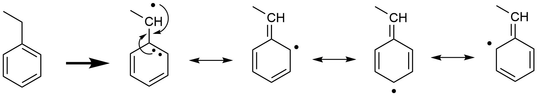 • nejstabilnější radikály – radikály vedle benzenového jádra (benzylový radikál) u ! stabilizace pomocí delokalizace !