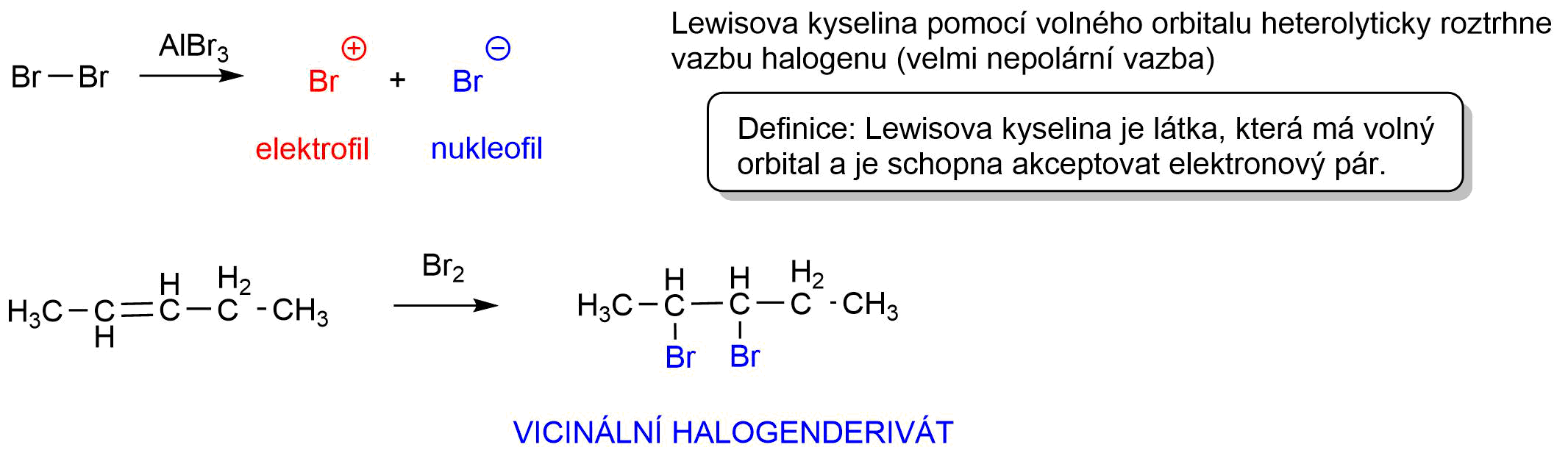 Obr. 3: Lewisova kyselina a příklad halogenace alkenu.
