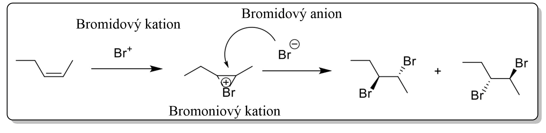 Halogenaci podstupují poměrně snadno chlór a brom. Jód s většinou alkenů nereaguje a fluor je příliš reaktivní (nutno speciální podmínky). Důležitým faktem je také to, že adice halogenů probíhá při vzniku trans isomerů! V prvním kroku se kation bromný (\(Br^+\)), jako elektrofil, naváže na dvojnou vazbu za vzniku bromoniového kationtu, který se bude stabilizovat reakcí s bromidovým aniontem. Bromidový anion k bromoniovému kationtu však přistoupí z opačné strany. Zdůvodnění je takové, že bromoniový kation je stericky objemný a bromidový anion má z opačné strany snazší přístup. Tato reakce je steroselektivní.