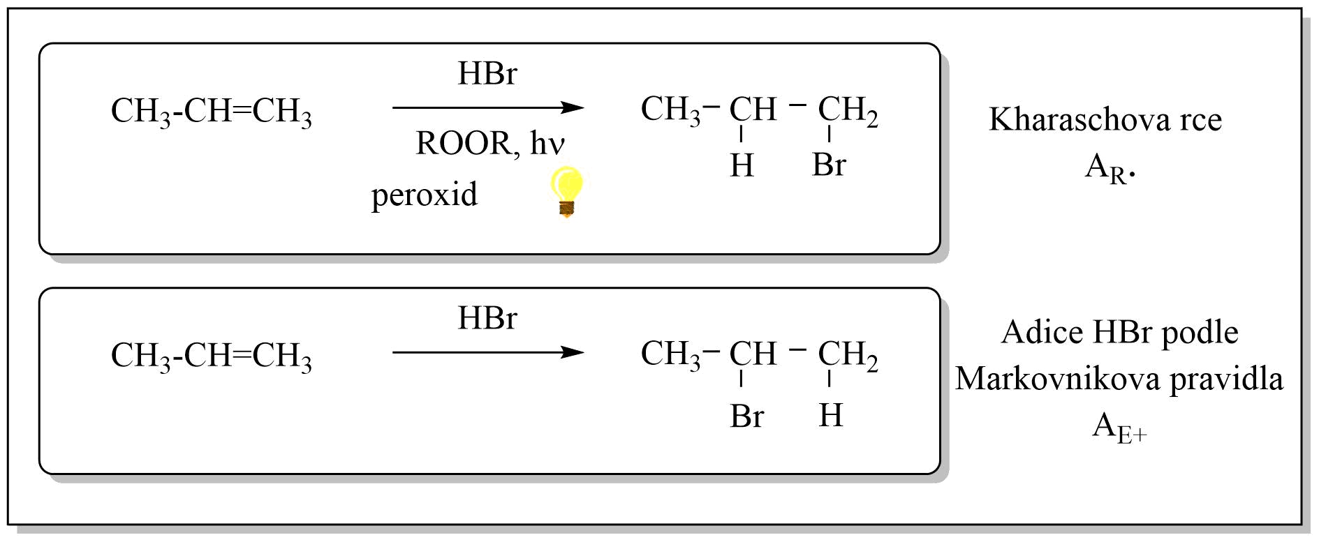 Obr.1: Markovnikovovo a Antimarkovnikovovo pravidlo u bromovodíku změnou podmínek!