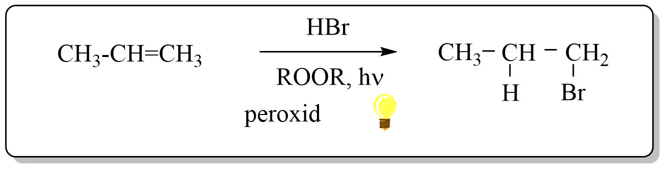 Tato reakce se nazývá Kharaschova adice a probíhá jen u bromovodíku. Ostatní halogenovodíky se radikálově neadují. Obě adice bromovodíku se vhodně doplňují.