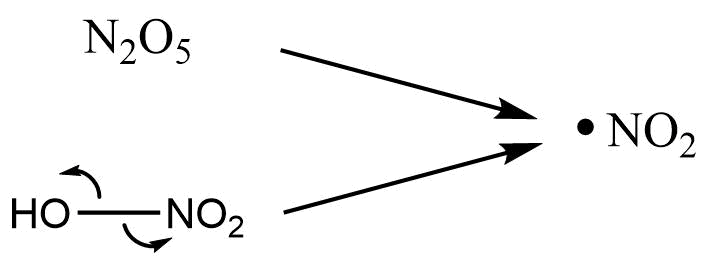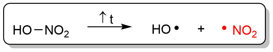 Ohledně využitých činidel si lze na následujích obrázkách všimnout, že se více bude využívat dimér NO2 než kyselina, jelikož vznikají u kyseliny 2 různé radikály. Tudíž budou vznikat produkty vedlejších reakcí.