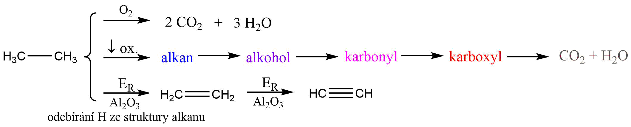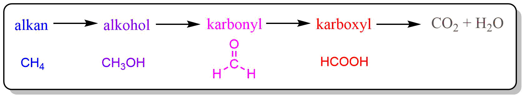 za přístupu dostatku \(O_2\) – úplná oxidace uhlovodíku, vzniká \(H_2O\) a \(CO_2\)