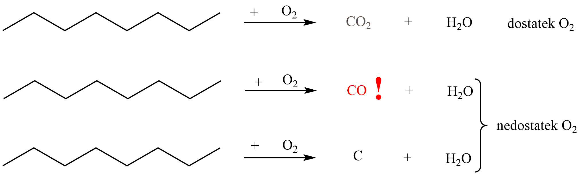 za nedostatku \(O_2\) – nedokonalé spalovaní, vzniká \(CO\) (případně saze \(C\)) a \(H_2O\)