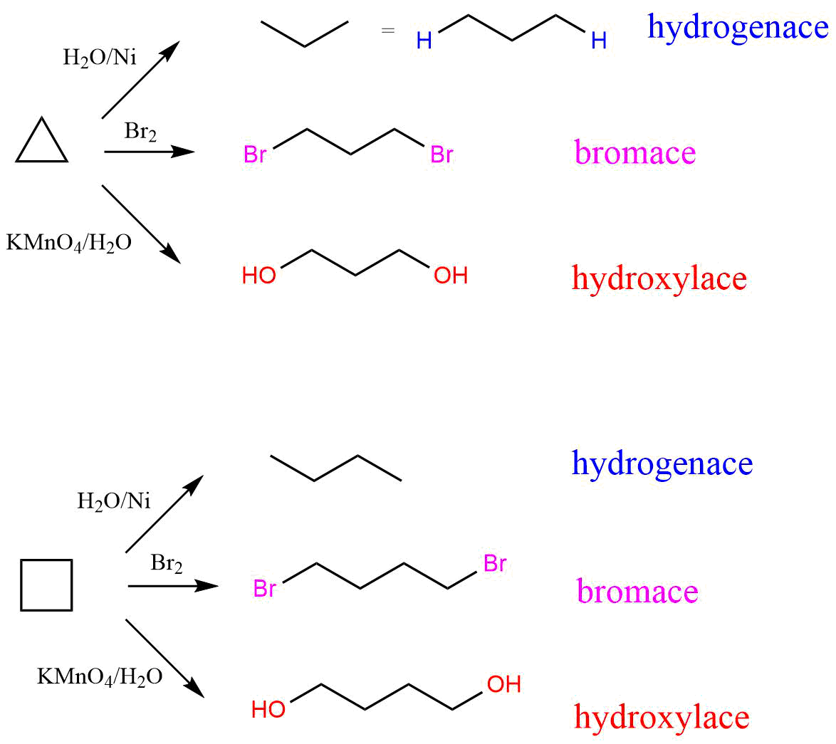 Obr. 1: Příklady rcí reaktivnějších nižších cykloalkanů (cyklopropan a cyklobutan)