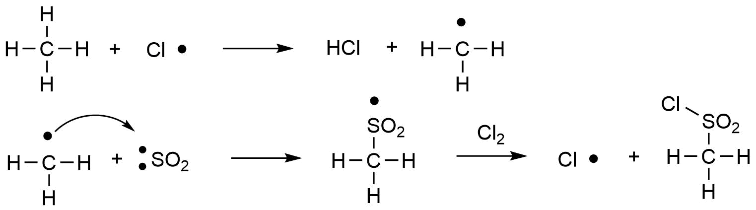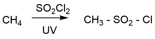 Chlorsulfonace (= sulfochlorace) je reakce obdobná jako halogenace. Místo halogenů se používá směs \(SO_2\) v \(Cl_2\), či činidlo \(SO_2Cl_2\) (chlorid sulfurylu). Mechanismus reakce je založený opět na radikálech. Obecně lze říci, že sulfochlorací se do struktury organické molekuly vnáší sulfochloridová skupina \([-SO_2Cl]\) místo vodíku. Schéma sulfochlorace methanu můžete vidět na následujícím obrázku.